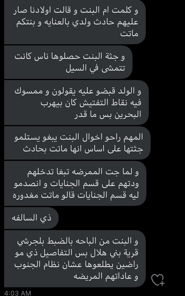 1 day ago · روان الغامدي ، ضجت مواقع التواصل الاجتماعي خلال الساعات الماضية عن قصة روان الغامدي وسبب مقتلها الأمر الذي هز الجميع وأثار الجدل في المجتمع الخليجي بانتشار الشائعات حولها على تويتر وانستقرام ، دون التأكد من صحتها. Aug 07, 2021 · صور قصة روان الغامدي. ولقد وضعنا لكم تفاصيل الوسم المتصدر ، وروان الغامدي متزوجة منذ أسبوع فقط، وأن زوجها اصطحابها في السيارة وضربها بحجر، وألقاها في مجرى السيل وبحسب الرواية المتداولة في المنصات الرقمية فإن أن زوج روان. وحسب المنشورات المتداولة علي شبكة تويتر، أن روان الغامدي، هي فتاة سعودية الجنسية، متزوجة منذ ما يقارب الـ7 أيام تقريبًا، أقدم زوجها علي ضربها ومعاملتها معاملة سيئة، ثم. 1 day ago · وأثار حادث مقتل روان الغامدي ضجة على مواقع التواصل الاجتماعي في السعودية، ودشن مغردون هاشتاج (رسم) باسم دم روان الغامدي طالبوا فيه بالقصاص من قاتلها، فيما طالب آخرون وزارة العدل بإضافة بند. صرحت قنوات وصحف ومواقع محلية، مساء اليوم يوم السبت 7 آب 2021، عن قاتل روان الغامدي في واحد من مدن المملكة العربية السعودية، حيث شهدت مواقع البحث في الإنترنت المشهورة طوال. وكشفت قريبة الشابة روان الغامدي لصحف المملكة أن زواج روان كان يوم الأربعاء قبل الماضي في جدة، وعقب ثلاثة أيام من زواجها تواصلت مع قريباتها تشتكي من زوجها الذي كان يضربها بغرض أخذ ذهبها. Aug 07, 2021 · تصدر هاشتاق القصاص من قتل روان على منصة التدوين العالمية ، ويطالب النشطاء من الجهات المعنية والرسمية بضرورة القصاص من زوج روان الغامدي ، فريق دار الحياة عكف على إقامة هذه المقالة وكتب لكم مستجدات هذه القضية. تعود تفاصيل قضية روان الغامدي، إلي قيام زواجها بقتلها بعد مرور 7 أيام فقط علي زواجهما، دون الكشف عن ملابسات سبب الوفاة حتى هذه اللحظات. قصة روان الغامدي ويكيبيديا؟، سنوفر لكم تفاصيل صادمة حول مقتل روان الغامدي، وقصة روان الغامدي ويكيبيديا، حيث تصدر هاشتاق القصاص من قتل روان على موقع التواصل الاجتماعي، إذ دعاء. Aug 07, 2021 · تفاصيل صادمة حول مقتل روان الغامدي. تفاصيل حادثة مقتل روان الغامدي. Aug 06, 2021 · قصة دم روان الغامدي.
